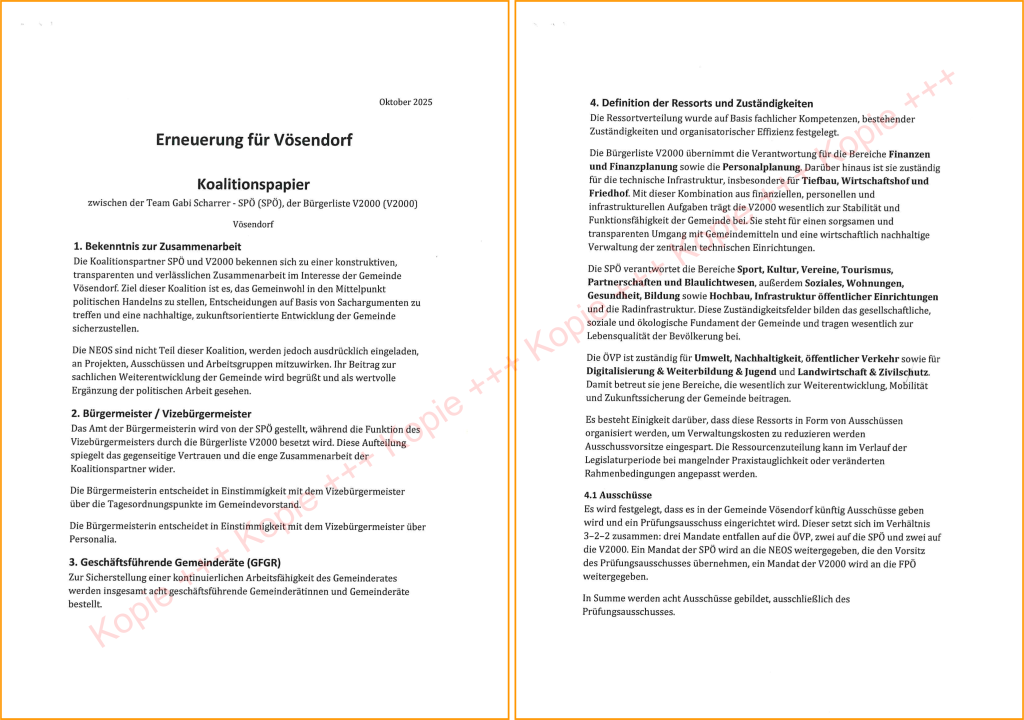 Nun steht diese Koalition mit der SPÖ – getragen von Vertrauen, Verantwortung und dem gemeinsamen Ziel, Vösendorf weiter voranzubringen. Wir werden mit aller Kraft daran arbeiten, Stabilität, Innovationen und Zukunftschancen für unsere Gemeinde zu sichern.